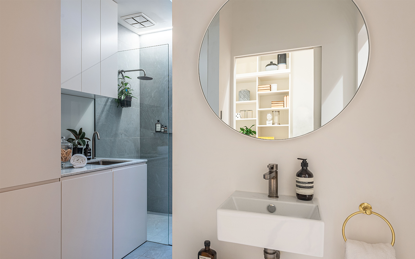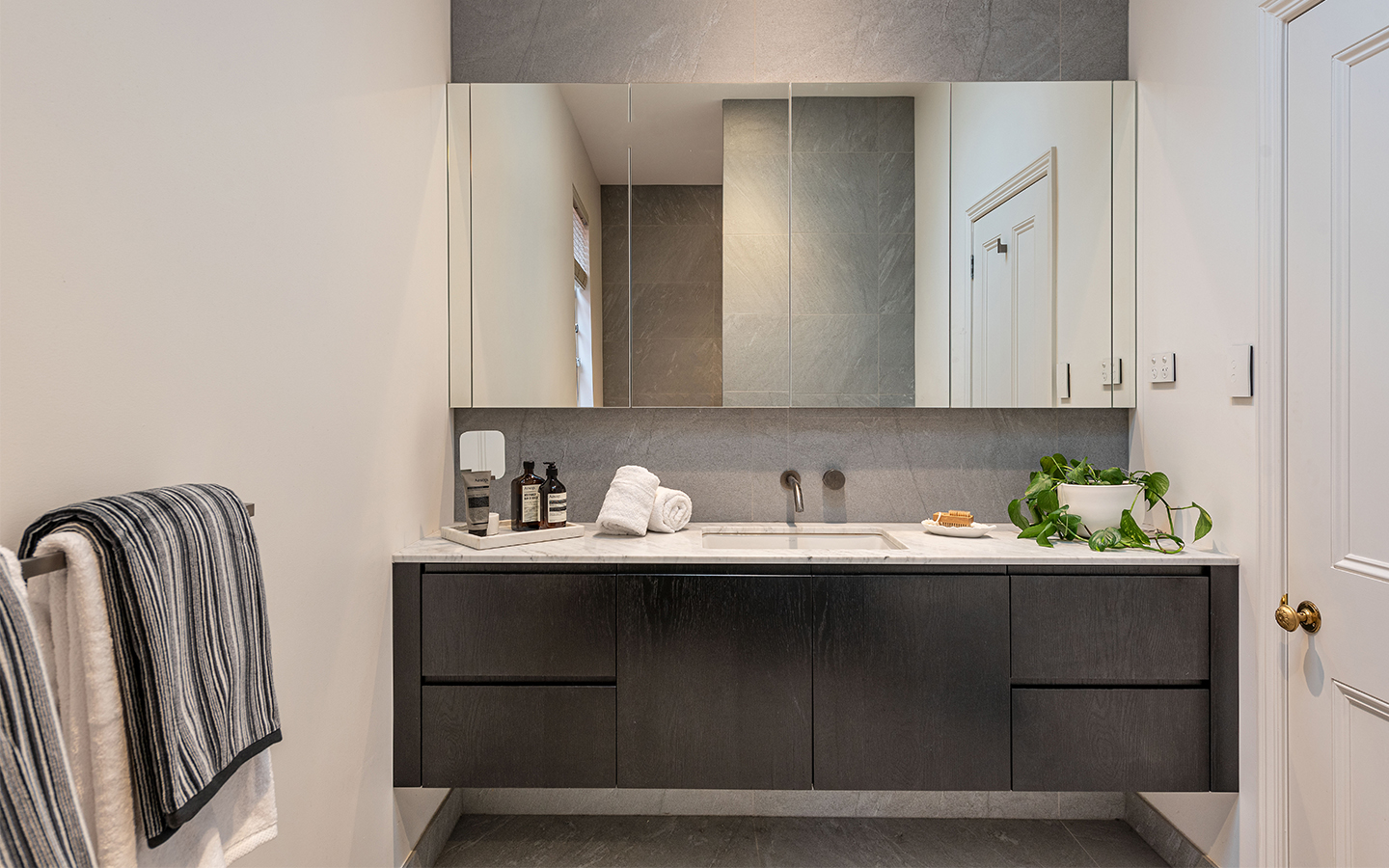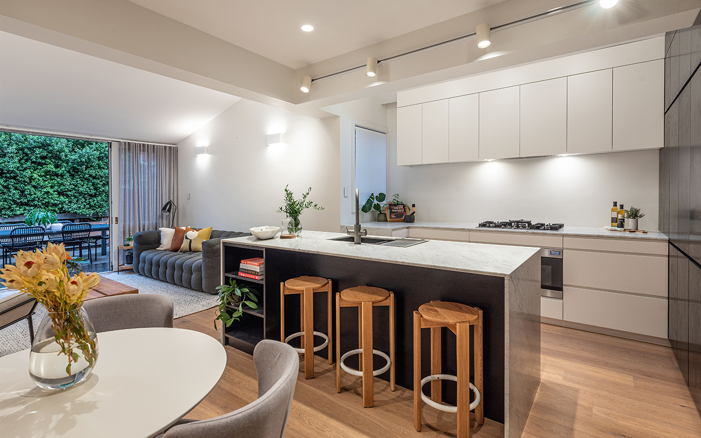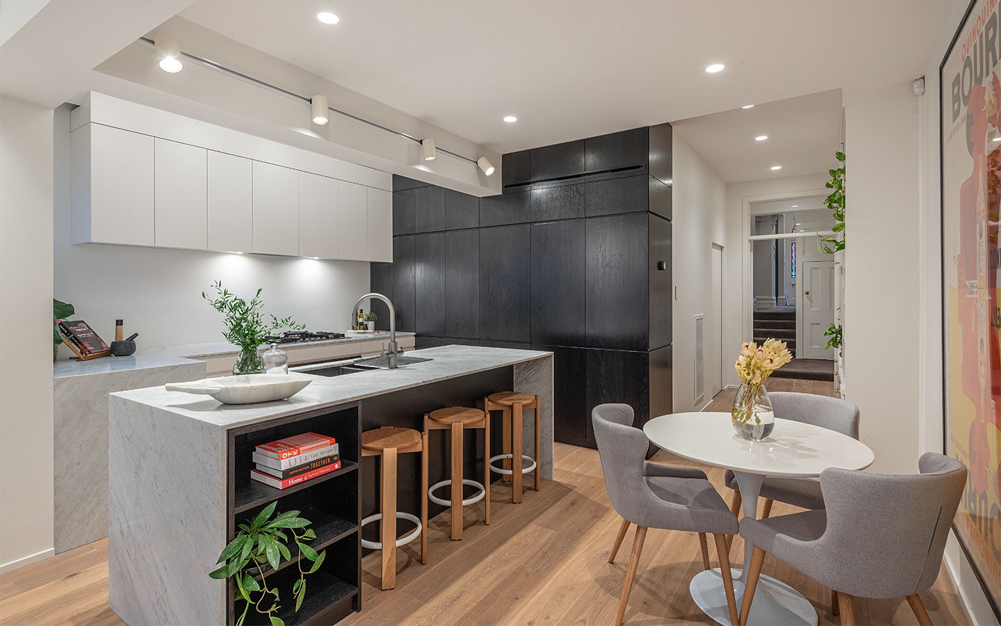 Internally, the dwelling was renovated with a design solution that aimed to be sympathetic to the history of the original house, with a more modern renovation to the additions at the rear of the dwelling. Natural light was introduced into the wet areas and the kitchen, with the use of Oak Floorboards, Japan Black veneer, Bianco Carrera marble benches and stone tiles contrast against the exposed brickwork of the existing dwelling.