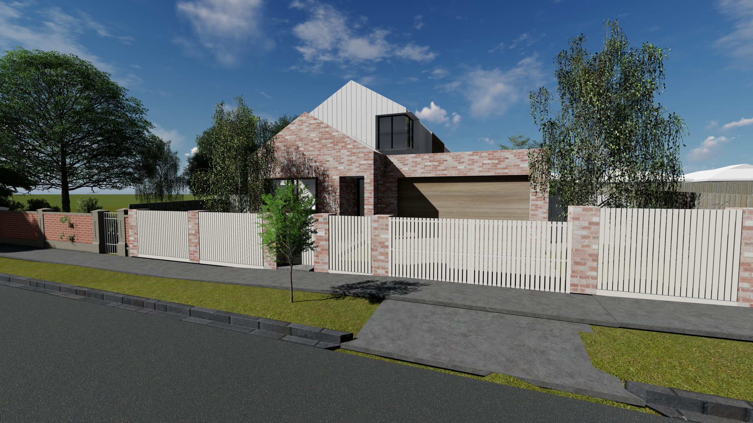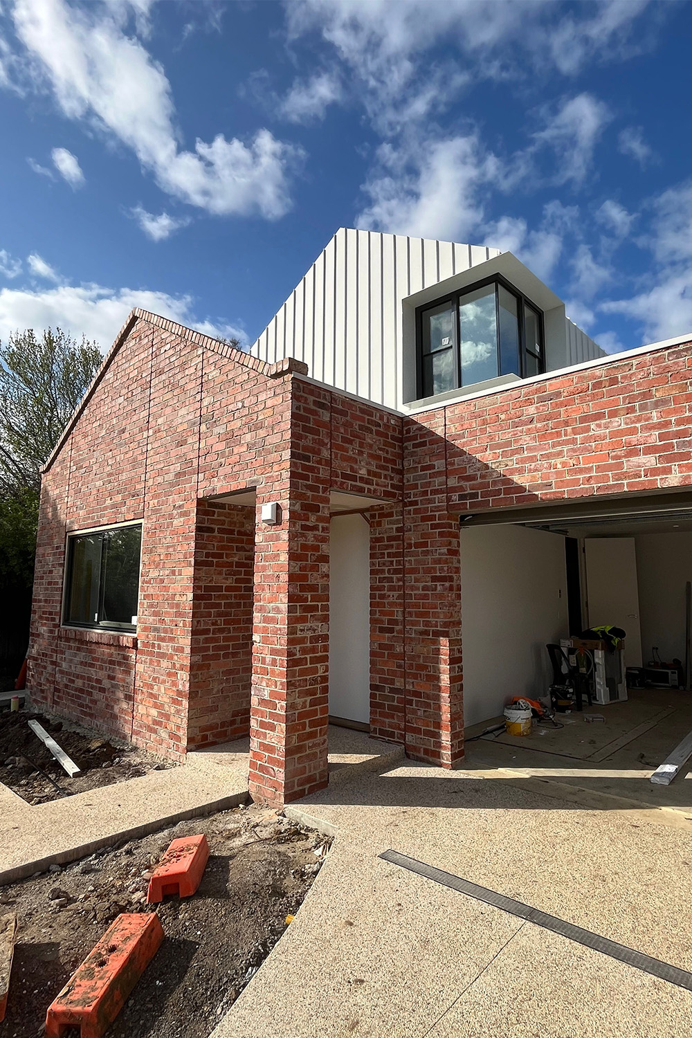 In a significant heritage overlay, the proposed replacement dwelling is a contemporary interpretation of surrounding building forms, with pitched gables clad in white metal cladding on level one over a recycled brick form to the ground floor.